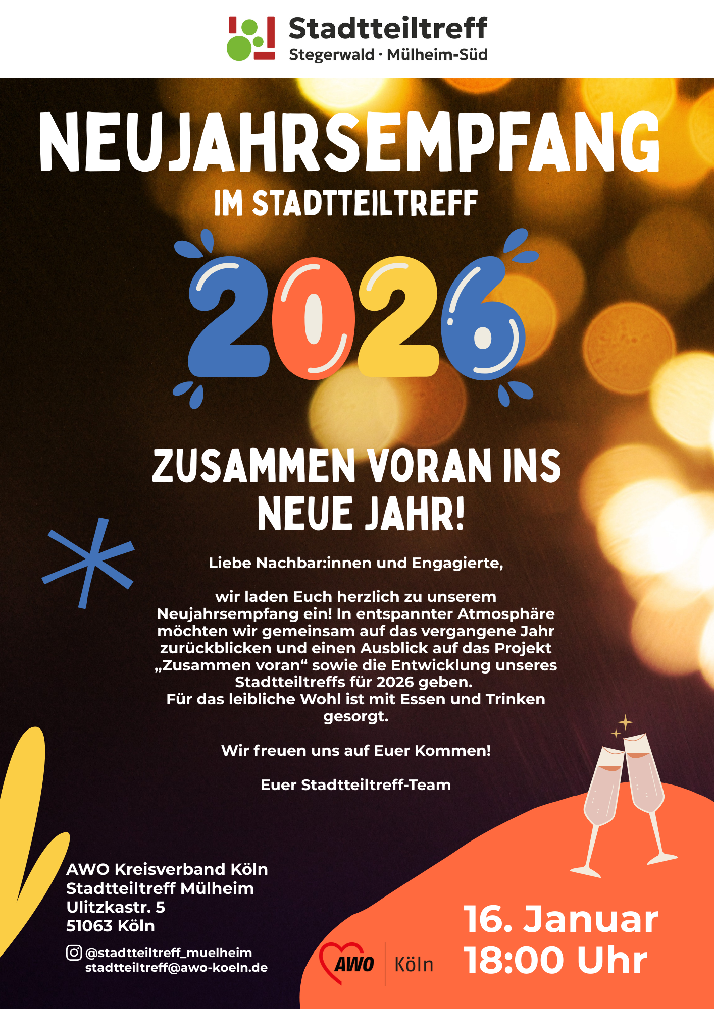 Hiermit laden wir Sie und Euch ganz herzlich zum Neujahrsempfang des AWO Stadtteiltreffs Mülheim ein.